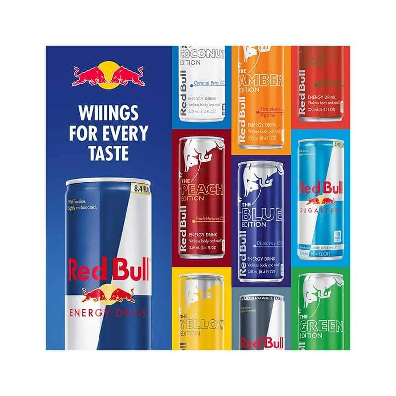 • Try our unique Red Bull Editions featuring the flavors of Strawberry Apricot, Peach-Nectarine, Juneberry, Watermelon, Blueberry and more; Sugar free options include Red Bull Sugar Free and Red Bull Zero